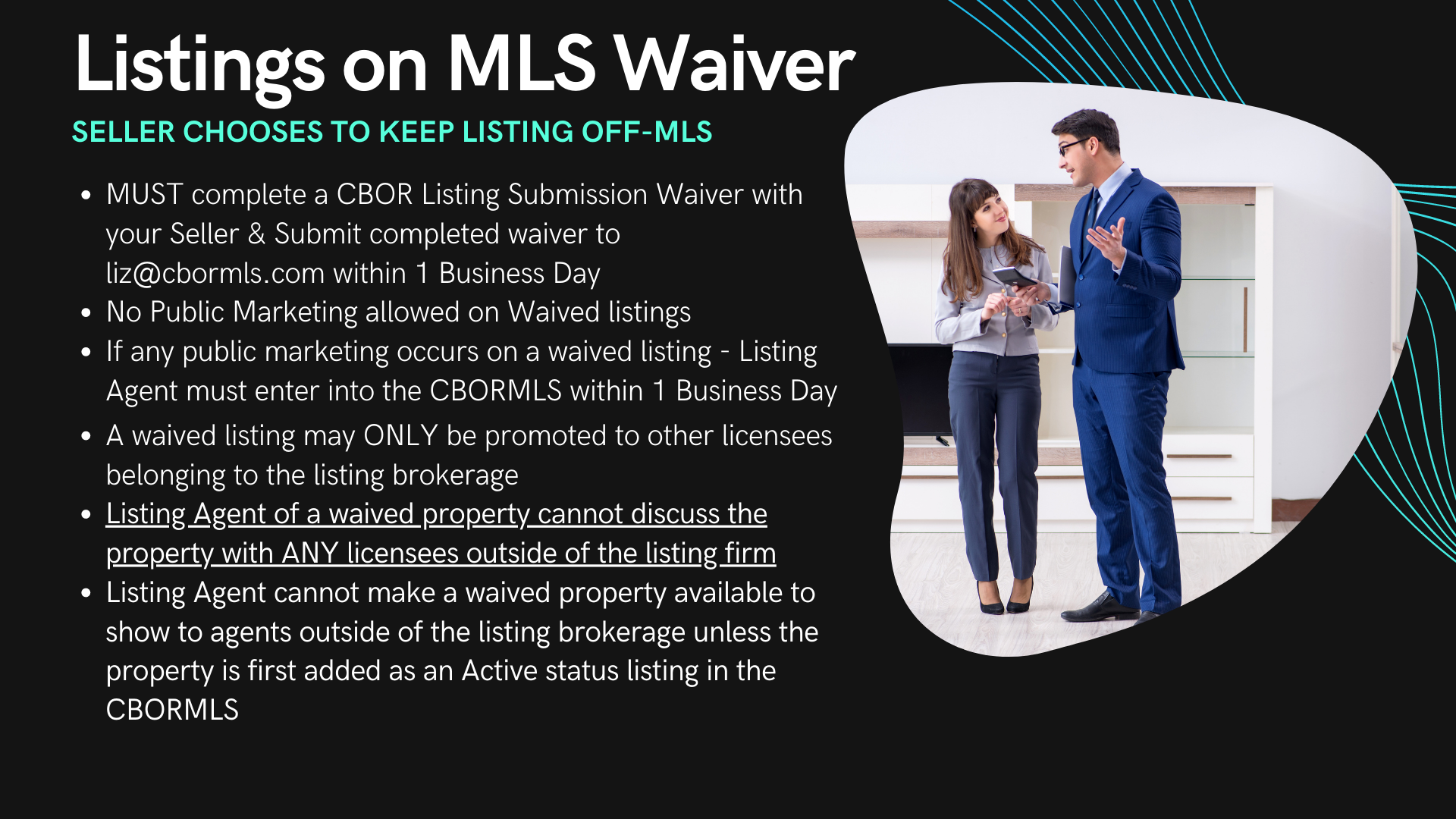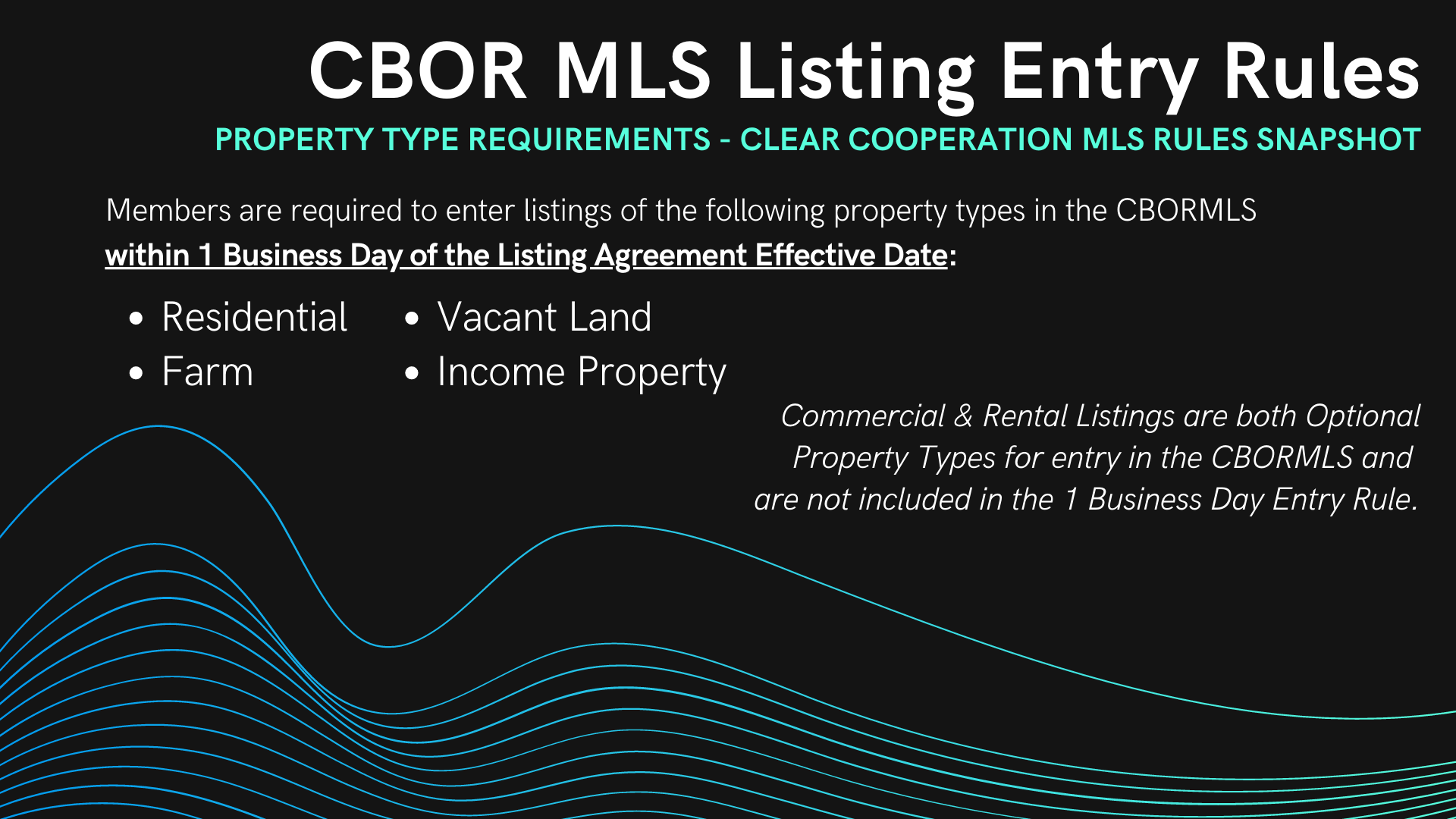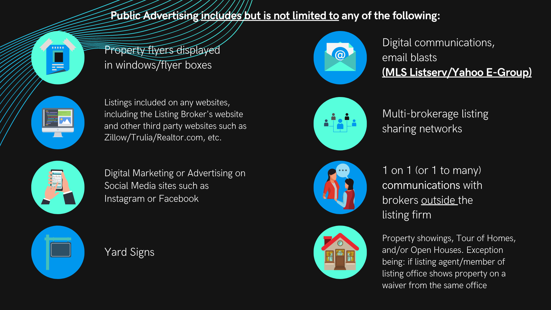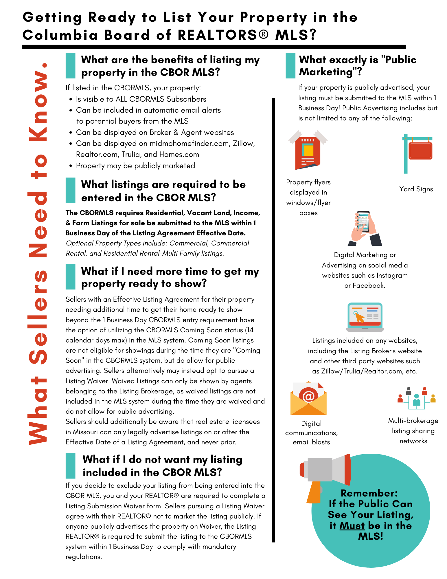 Within one (1) business day* of marketing a property to the public, the listing broker must submit the listing to the MLS for cooperation with other MLS participants. Public marketing includes, but is not limited to, flyers displayed in windows, yard signs, digital marketing on public facing websites, brokerage website displays (including IDX and VOW), digital communications marketing (email blasts), multi-brokerage listing sharing networks, and applications available to the general public. (Adopted 11/19)