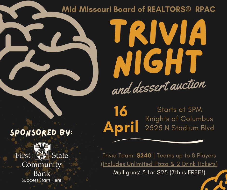 Grab your smartest friends and join us for a fun evening supporting RPAC! We’re heading to Knights of Columbus starting at 5:00 PM — featuring a new trivia emcee, a crowd-favorite dessert auction, and plenty of friendly competition.